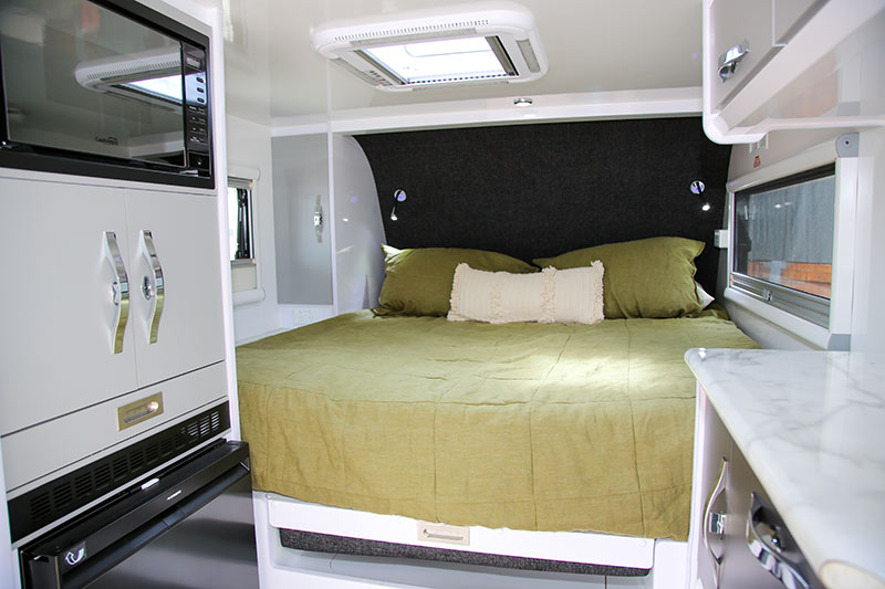 A major point of difference between this and other vans is the point of entry. While caravans have a typical door, a large section of the SRS 9’s rear wall lifts on gas struts. It may look heavy and cumbersome, but it’s really not – the gas struts do all of the heavy lifting.