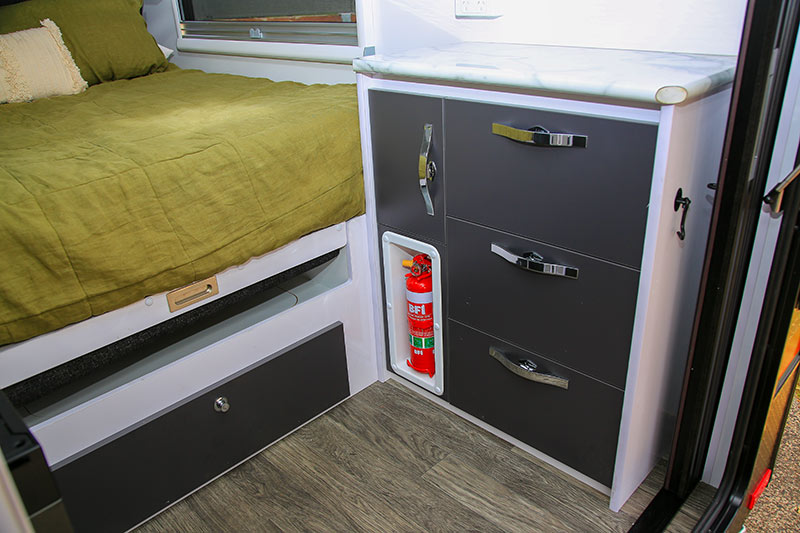 Speaking of water, the SRS 9 comes standard with a 120L fresh water tank; however, a grey water tank isn’t included, nor does it have a conventional sullage outlet. The reason: the kitchen and shower are external. The shower floor has a drainage point from which you could run a hose, and you could easily collect the sink water in a bucket.