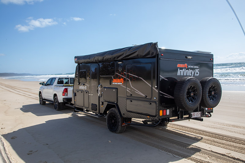 I know this is a strange way to describe towing a caravan but these were the words that came to mind as I hauled it towards Teewah Beach. I think there are a few reasons for the way it performs. Obviously, the low centre of gravity helps. Being a pop-top, the travel height and wind drag are decreased. I also noticed in my mirrors that it was slightly narrower that some full-size vans, helping with decreasing the work load on the car and making it easier to manoeuvre.