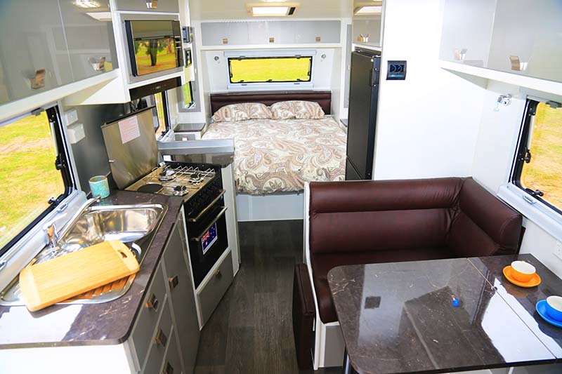 The rest of the interior is classy, too, from the slightly angled kitchen bench to the dinette, the forward bedroom with ample storage space (though the aforementioned tunnel boot does encroach on the under-bed storage, naturally), and even the colour scheme.