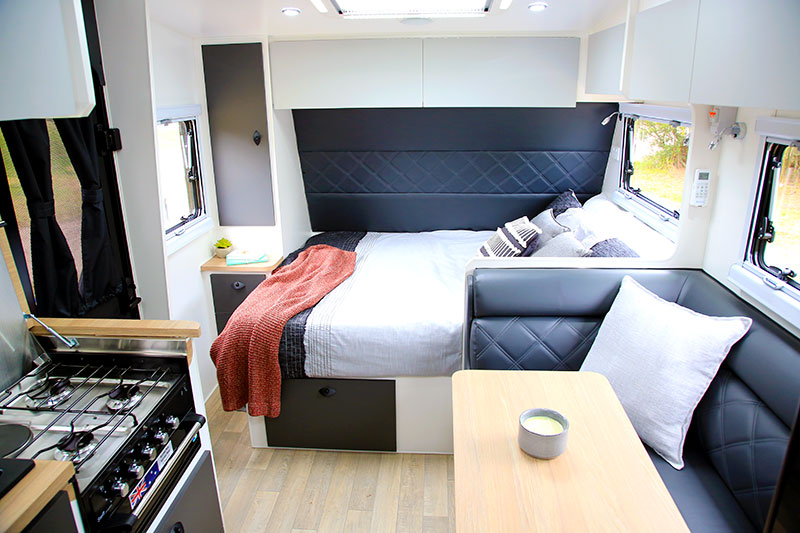 The kitchen, meanwhile, features a stylish black sink with matching tapware, a four-burner Swift cooktop and griller, some drawers, cupboards and overhead lockers, and Kokoda has even fitted a swivel-arm bracket to the far wall for the 24in flatscreen TV that comes standard.