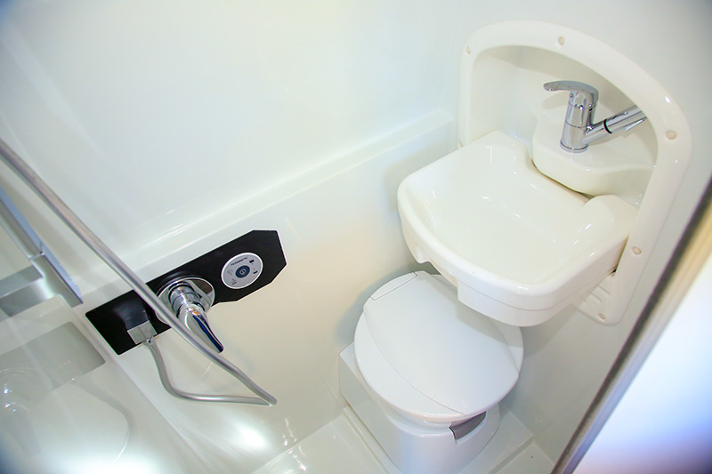 Let’s take a quick look at the bathroom. As they always are in commercial van conversions, the bathroom is a combo unit. It’s a one-piece moulded fibreglass cubicle that includes a cassette toilet and a hand held shower. The washbasin, however, folds out from the wall. Though it isn’t unique to Snowy River, it’s a good, space-saving design. Layout 3 contains a more traditional washbasin setup, it that’s your preference.
